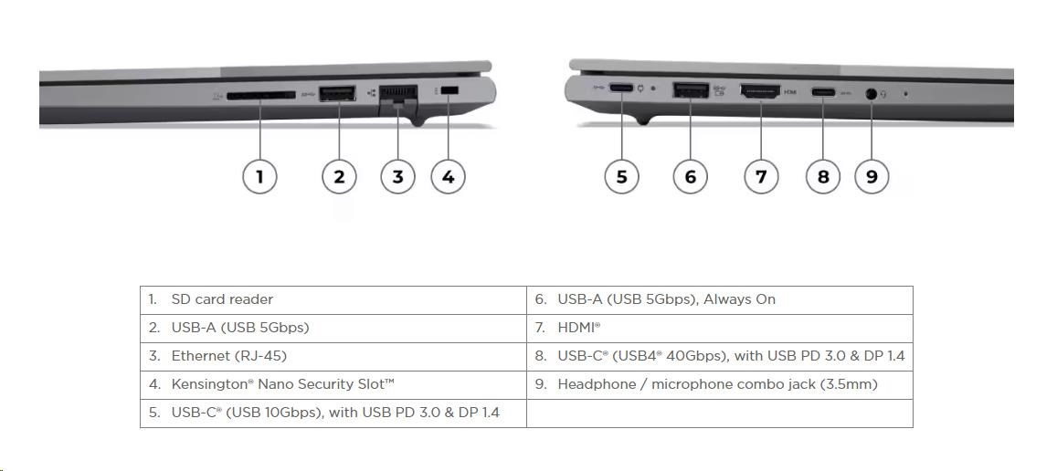 | Standartné porty | 1x USB-A (USB 5Gbps / USB 3.2 Gen 1) 1x USB-A (USB 5Gbps / USB 3.2 Gen 1), Always On 1x USB-C® (USB 10Gbps / USB 3.2 Gen 2), with USB PD 3.0 and DisplayPort™ 1.4 1x USB-C® (USB4® 40Gbps), with USB PD 3.0 and DisplayPort™ 1.4 1x HDMI® 2.1, up to 4K/60Hz 1x Headphone / microphone combo jack (3.5mm) 1x Ethernet (RJ-45) 1x SD card reader |