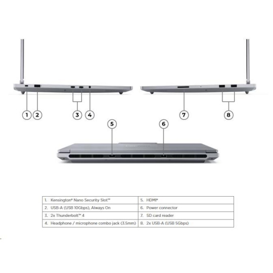| Standartné porty | 2x USB-A (USB 5Gbps / USB 3.2 Gen 1) 1x USB-A (USB 10Gbps / USB 3.2 Gen 2), Always On 2x USB-C® (Thunderbolt™ 4 / USB4® 40Gbps), with USB PD 3.0 and DisplayPort™ 2.1 1x HDMI® 2.1, up to 8K/60Hz 1x Headphone / microphone combo jack (3.5mm) 1x SD card reader 1x Magic Bay (pogo pin connector) 1x Power connector |