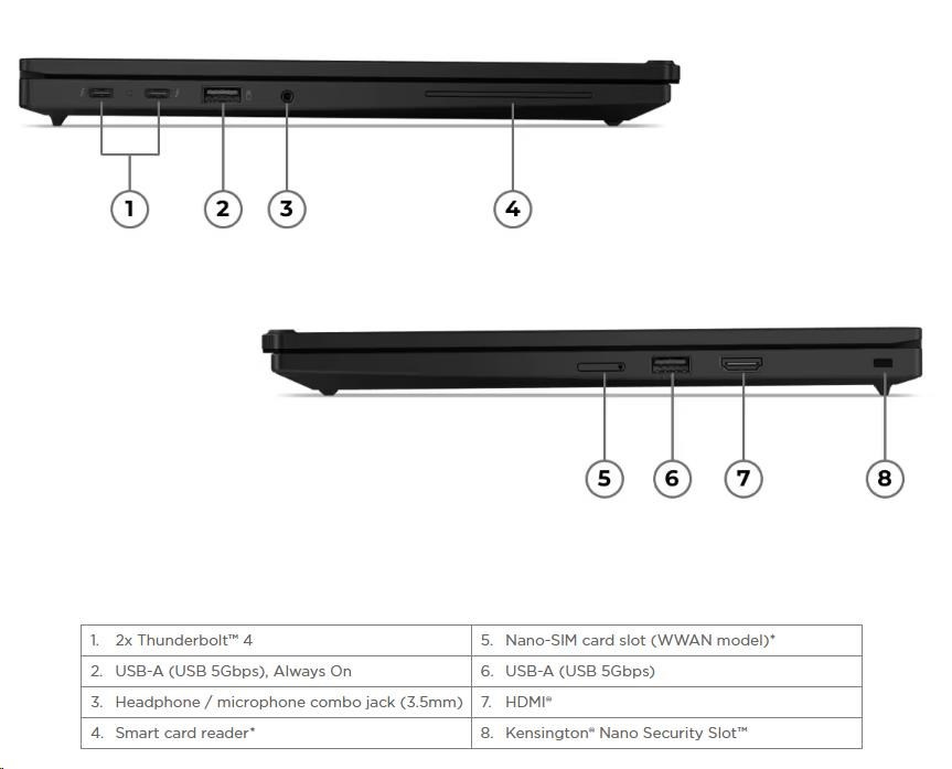 | Standartné porty | 2x USB-A (USB 5Gbps / USB 3.2 Gen 1), one Always On 2x USB-C® (Thunderbolt™ 4 / USB4® 40Gbps), with USB PD 3.1 and DisplayPort™ 2.1 1x HDMI® 2.1, up to 4K/60Hz 1x Headphone / microphone combo jack (3.5mm) |