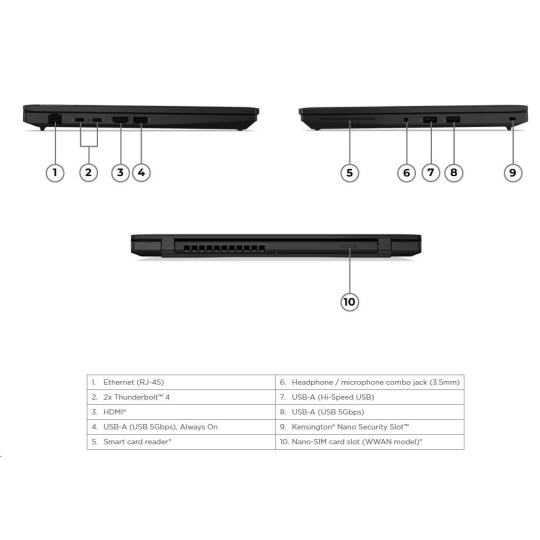 | Standartné porty | 1x USB-A (Hi-Speed USB / USB 2.0) 2x USB-A (USB 5Gbps / USB 3.2 Gen 1), one Always On 2x USB-C® (Thunderbolt™ 4 / USB4® 40Gbps), with USB PD 3.1 and DisplayPort™ 2.1 1x HDMI® 2.1, up to 4K/60Hz 1x Headphone / microphone combo jack (3.5mm) 1x Ethernet (RJ-45) |