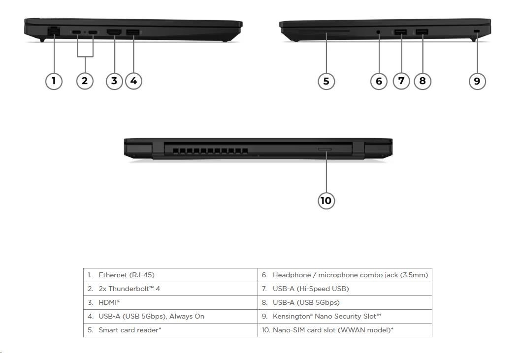 | Standartné porty | 1x USB-A (Hi-Speed USB / USB 2.0) 2x USB-A (USB 5Gbps / USB 3.2 Gen 1), one Always On 2x USB-C® (Thunderbolt™ 4 / USB4® 40Gbps), with USB PD 3.1 and DisplayPort™ 2.1 1x HDMI® 2.1, up to 4K/60Hz 1x Headphone / microphone combo jack (3.5mm) 1x Ethernet (RJ-45) |