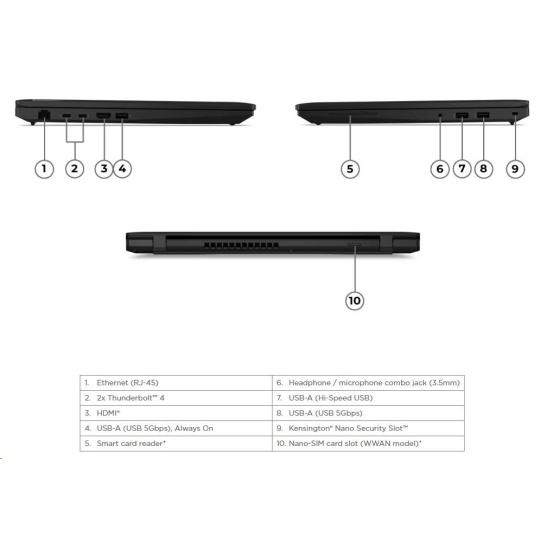 | Standartné porty | 1x USB-A (Hi-Speed USB / USB 2.0) 2x USB-A (USB 5Gbps / USB 3.2 Gen 1), one Always On 2x USB-C® (Thunderbolt™ 4 / USB4® 40Gbps), with USB PD 3.1 and DisplayPort™ 2.1 1x HDMI® 2.1, up to 4K/60Hz 1x Headphone / microphone combo jack (3.5mm) 1x Ethernet (RJ-45) |