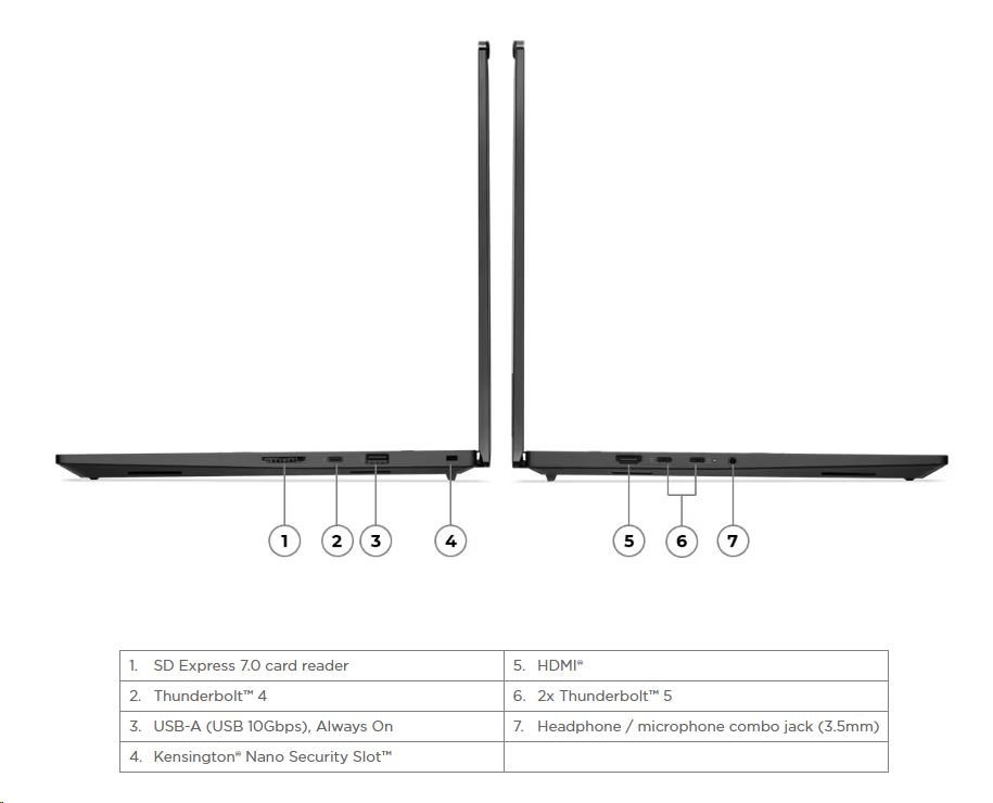 | Standartné porty | 1x USB-A (USB 10Gbps / USB 3.2 Gen 2), Always On 2x Thunderbolt™ 5, with USB PD 3.1 and DisplayPort™ 2.1, 140W input / 15W outpu 1x Thunderbolt™ 4, with DisplayPort™ 2.1 and USB PD 3.1, 140W input / 15W output 1x HDMI® 2.1, up to 8K/60Hz 1x Headphone / microphone combo jack (3.5mm) 1x SD Express 7.0 card reader |