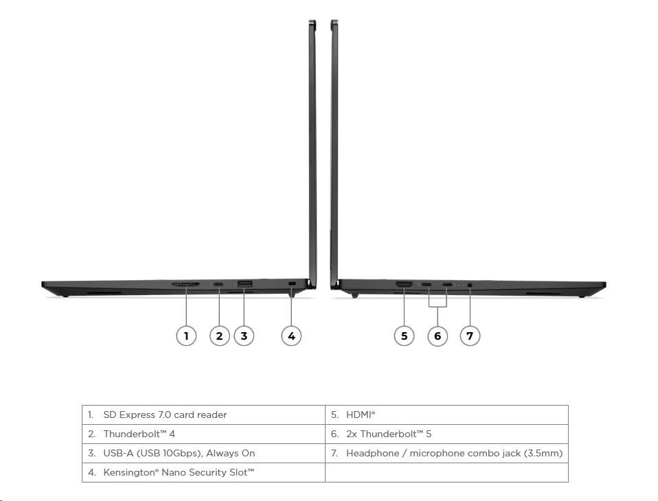 | Standartné porty | 1x USB-A (USB 10Gbps / USB 3.2 Gen 2), Always On 2x Thunderbolt™ 5, with USB PD 3.1 and DisplayPort™ 2.1, 140W input / 15W outpu 1x Thunderbolt™ 4, with DisplayPort™ 2.1 and USB PD 3.1, 140W input / 15W output 1x HDMI® 2.1, up to 8K/60Hz 1x Headphone / microphone combo jack (3.5mm) 1x SD Express 7.0 card reader |