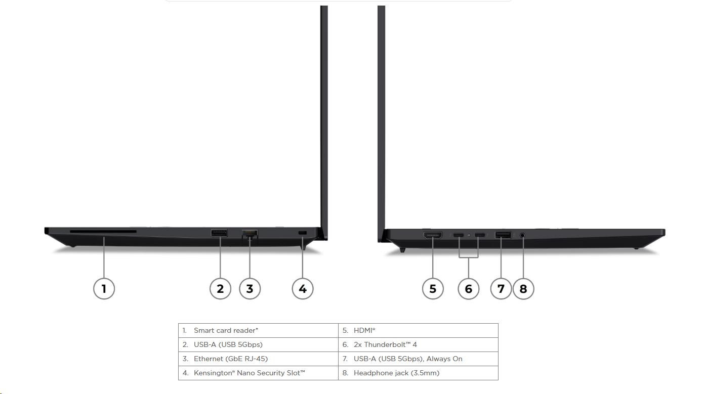 | Standartné porty | 1x USB-A (USB 5Gbps / USB 3.2 Gen 1) 1x USB-A (USB 5Gbps / USB 3.2 Gen 1), Always On 2x Thunderbolt™ 4, with USB PD 3.0 1x HDMI® 2.1, up to 4K/60Hz 1x Headphone / microphone combo jack (3.5mm) 1x Ethernet (GbE RJ-45) 1x Security keyhole 1x Smart Card Reader |