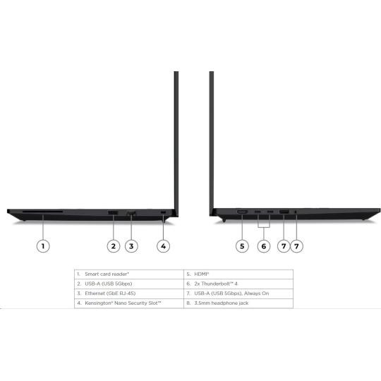 | Standartné porty | 1x USB-A (USB 5Gbps / USB 3.2 Gen 1) 1x USB-A (USB 5Gbps / USB 3.2 Gen 1), Always On 2x USB-C® (Thunderbolt™ 4 / USB4® 40Gbps), with USB PD 3.0 and DisplayPort™ 2.1 1x HDMI® 2.1, up to 4K/60Hz 1x Headphone / microphone combo jack (3.5mm) 1x Ethernet (RJ-45) 1x Security keyhole |