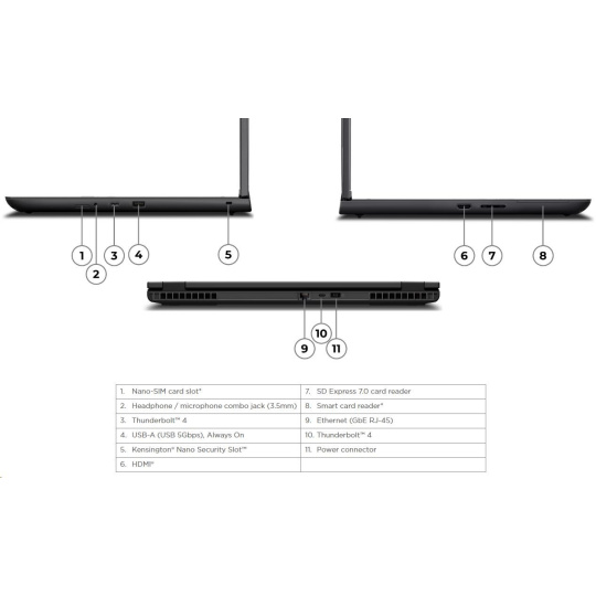 | Standartné porty | 1x USB-A (USB 5Gbps / USB 3.2 Gen 1), Always On 2x USB-C® (Thunderbolt™ 4 / USB4® 40Gbps), with USB PD 3.0 and DisplayPort™ 2.1 1x HDMI® 2.1, up to 8K/60Hz 1x Headphone / microphone combo jack (3.5mm) 1x Ethernet (RJ-45) 1x SD Express 7.0 card reader 1x Security keyhole |