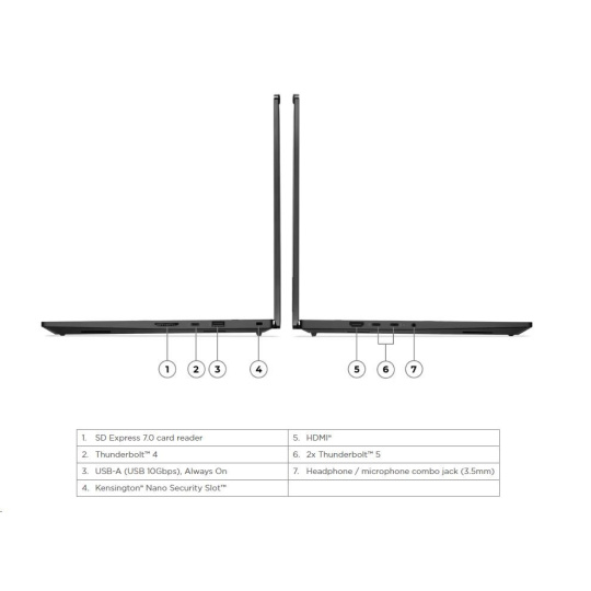| Standartné porty | 1x USB-A (USB 10Gbps / USB 3.2 Gen 2), Always On 2x Thunderbolt™ 5, with USB PD 3.1 and DisplayPort™ 2.1, 140W input / 15W outpu 1x Thunderbolt™ 4, with DisplayPort™ 2.1 and USB PD 3.1, 140W input / 15W output 1x HDMI® 2.1, up to 8K/60Hz 1x Headphone / microphone combo jack (3.5mm) 1x SD Express 7.0 card reader |