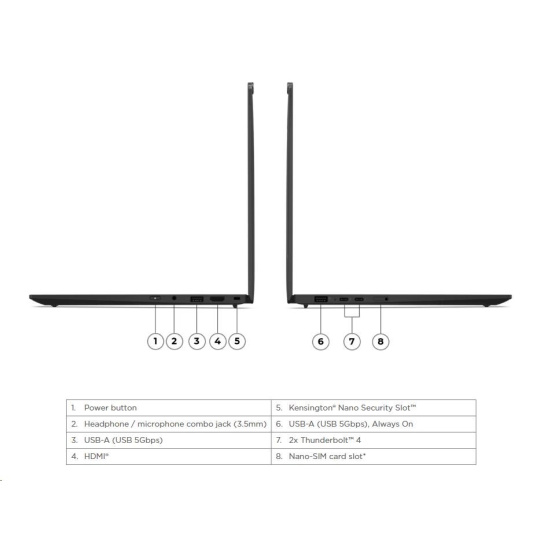 | Standartné porty | 1x USB-A (USB 5Gbps / USB 3.2 Gen 1) 1x USB-A (USB 5Gbps / USB 3.2 Gen 1), Always On 2x USB-C® (Thunderbolt™ 4 / USB4® 40Gbps), with USB PD 3.0 and DisplayPort™ 2.1 1x HDMI® 2.1, up to 4K/60Hz 1x Headphone / microphone combo jack (3.5mm) |