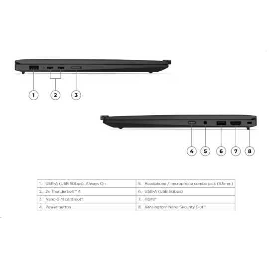 | Standartné porty | 1x USB-A (USB 5Gbps / USB 3.2 Gen 1) 1x USB-A (USB 5Gbps / USB 3.2 Gen 1), Always On 2x USB-C® (Thunderbolt™ 4 / USB4® 40Gbps), with USB PD 3.0 and DisplayPort™ 2.1 1x HDMI® 2.1, up to 4K/60Hz 1x Headphone / microphone combo jack (3.5mm) |