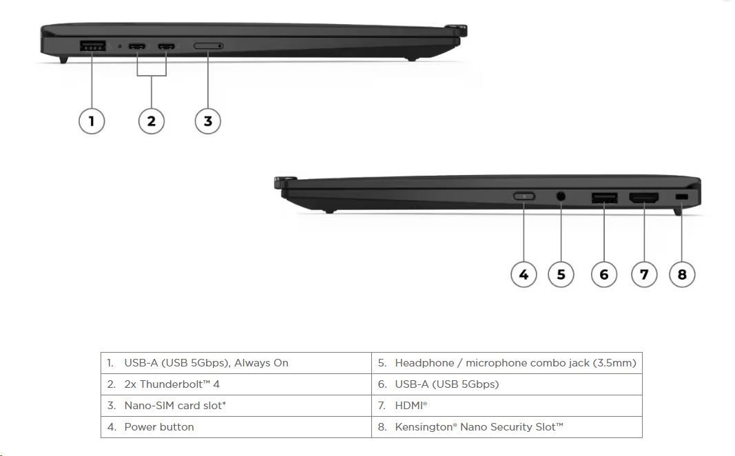 | Standartné porty | 1x USB-A (USB 5Gbps / USB 3.2 Gen 1) 1x USB-A (USB 5Gbps / USB 3.2 Gen 1), Always On 2x USB-C® (Thunderbolt™ 4 / USB4® 40Gbps), with USB PD 3.0 and DisplayPort™ 2.1 1x HDMI® 2.1, up to 4K/60Hz 1x Headphone / microphone combo jack (3.5mm) |