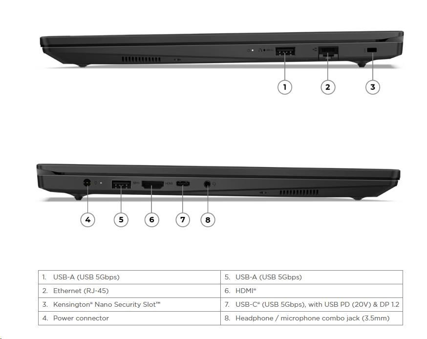 | Štandardné porty | 2x USB-A (USB 5Gbps / USB 3.2 Gen 1) 1x USB-C® (USB 5Gbps / USB 3.2 Gen 1), s USB Power Delivery (len 20V) a DisplayPort™ 1.2 1x HDMI® 1.4b 1x kombinovaný audio jack (3,5mm) 1x Ethernet (RJ-45) 1x Napájací konektor |