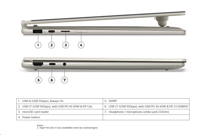 | Standartné porty | 1x USB-A (USB 5Gbps), Always On 1x USB-C® (USB 10Gbps), with USB PD 45-65W and DisplayPort™ 1.4a 1x USB-C® (USB 10Gbps), with USB PD 45-65W and DisplayPort™ 2.1 UHBR10 1x HDMI® 2.1, up to 4K/60Hz 1x Headphone / microphone combo jack (3.5mm) 1x microSD card reader |