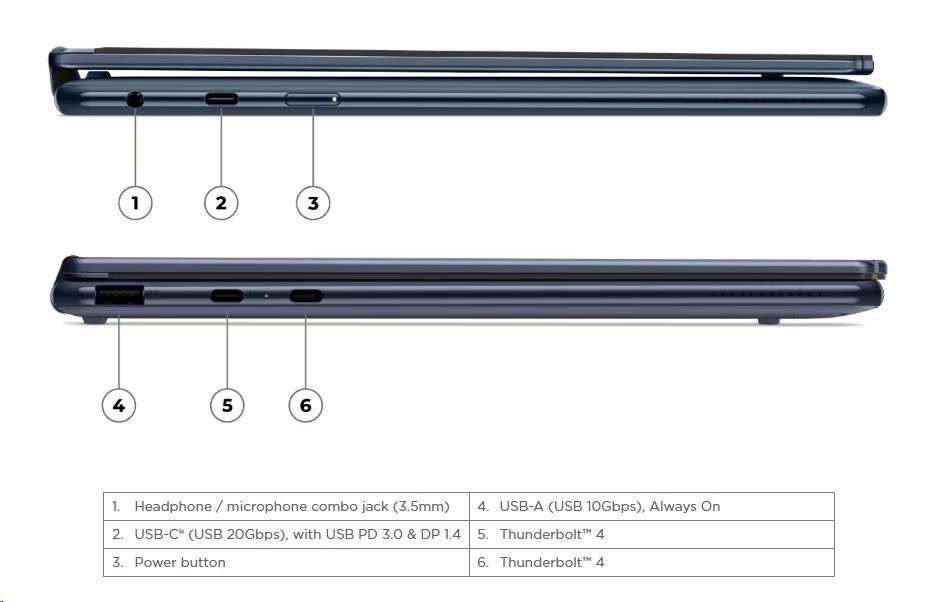 Standartné porty | 1x USB-A (USB 10Gbps / USB 3.2 Gen 2), Always On 1x USB-C® (USB 20Gbps / USB4® Gen 2x2), with USB PD 3.0 and DisplayPort™ 1.4 2x USB-C® (Thunderbolt™ 4 / USB4® 40Gbps), with USB PD 3.0 and DisplayPort™ 2.1 1x Headphone / microphone combo jack (3.5mm) |