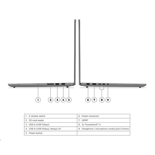| Standartné porty | 1x USB-A (USB 5Gbps / USB 3.2 Gen 1) 1x USB-A (USB 5Gbps / USB 3.2 Gen 1), Always On 2x USB-C® (Thunderbolt™ 4 / USB4® 40Gbps), with USB PD 65-100W and DisplayPort™ 2.1 1x HDMI® 2.1, up to 8K/60Hz 1x Headphone / microphone combo jack (3.5mm) 1x SD card reader 1x Power connector |