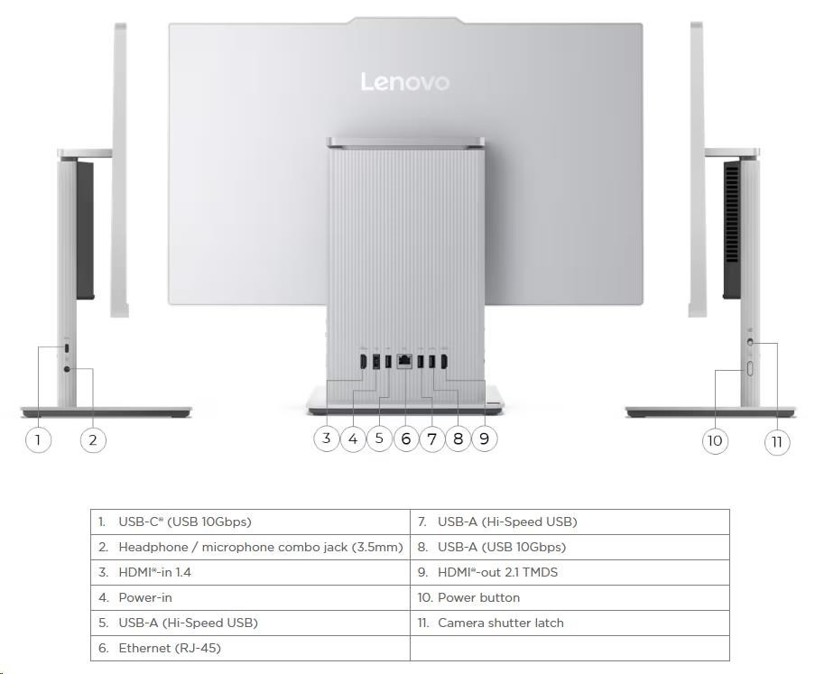 | Standartné porty | 1x USB-A (USB 10Gbps / USB 3.2 Gen 2) 2x USB-A (Hi-Speed USB / USB 2.0) 1x HDMI®-in 1.4 1x HDMI®-out 2.1 TMDS 1x Ethernet (RJ-45) 1x power connector 1x USB-C® (USB 10Gbps / USB 3.2 Gen 2), data transfer only 1x headphone / microphone combo jack (3.5mm) | |