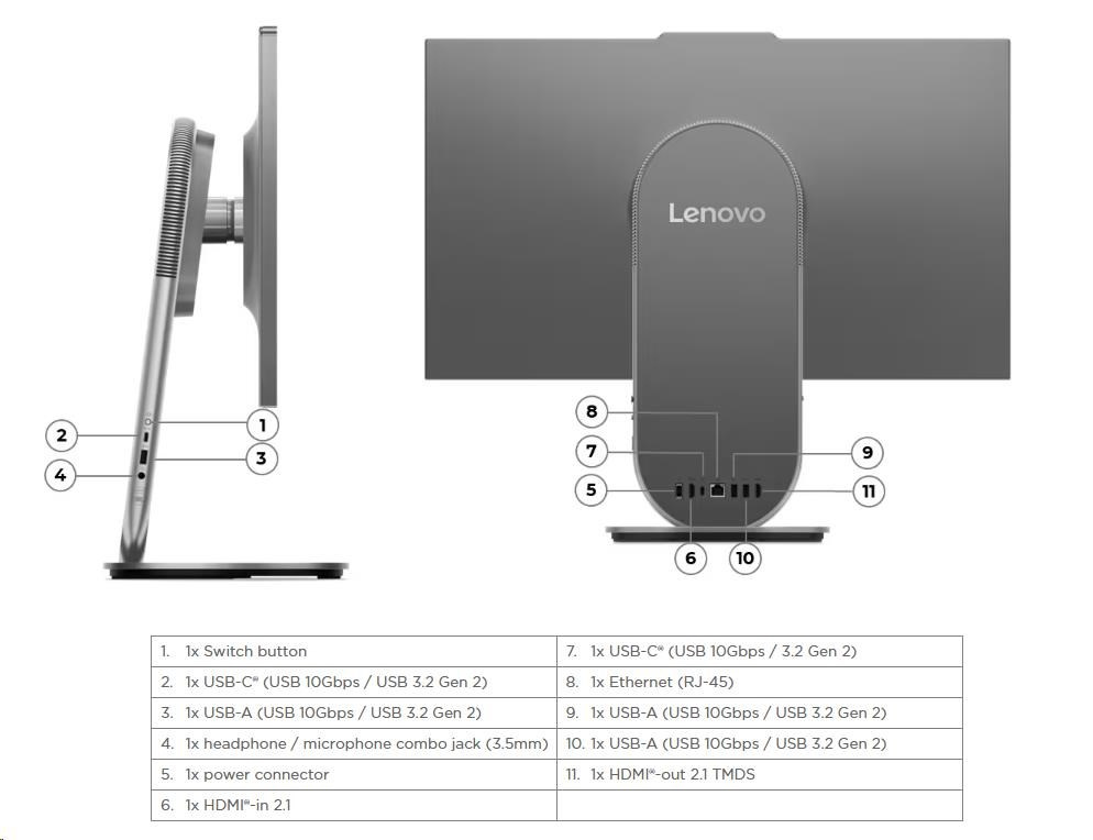 Zadné porty | 1x USB-C® (USB 10Gbps / 3.2 Gen 2) 2x USB-A (USB 10Gbps / USB 3.2 Gen 2) 1x HDMI®-in 2.1 1x HDMI®-out 2.1 TMDS 1x Ethernet (RJ-45) 1x power connector |