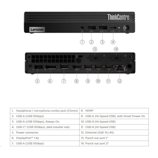 | Predné porty | 1x USB-C® (USB 10Gbps / USB 3.2 Gen 2), data transfer only 1x USB-A (USB 10Gbps / USB 3.2 Gen 2), with Always On and 5V@2.1A charging 1x USB-A (USB 10Gbps / USB 3.2 Gen 2) 1x headphone / microphone combo jack (3.5mm) |