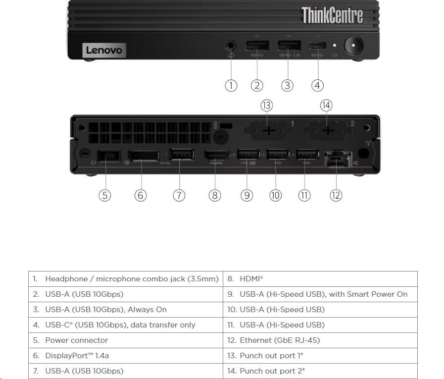 | Predné porty | 1x USB-C® (USB 10Gbps / USB 3.2 Gen 2), data transfer only 1x USB-A (USB 10Gbps / USB 3.2 Gen 2), with Always On and 5V@2.1A charging 1x USB-A (USB 10Gbps / USB 3.2 Gen 2) 1x headphone / microphone combo jack (3.5mm) |