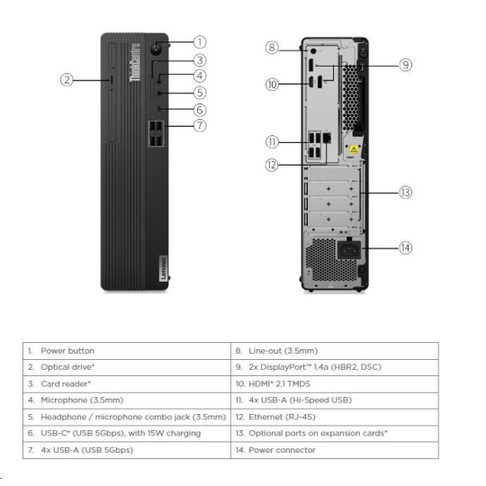 | Predné porty | 1x USB-C® (USB 5Gbps / USB 3.2 Gen 1), with 15W charging 4x USB-A (USB 5Gbps / USB 3.2 Gen 1) 1x headphone (3.5mm) 1x headphone / microphone combo jack (3.5mm)  |