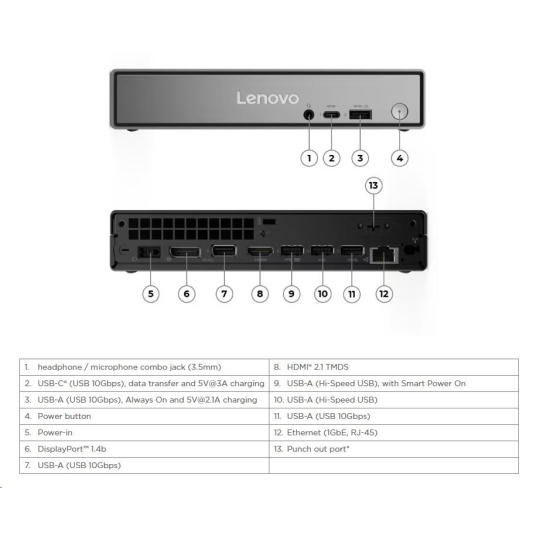 | Predné porty | 1x USB-C® (USB 10Gbps / USB 3.2 Gen 2), with data transfer and 5V@3A charging 1x USB-A (USB 10Gbps / USB 3.2 Gen 2), with Always On and 5V@2.1A charging 1x headphone / microphone combo jack (3.5mm) |