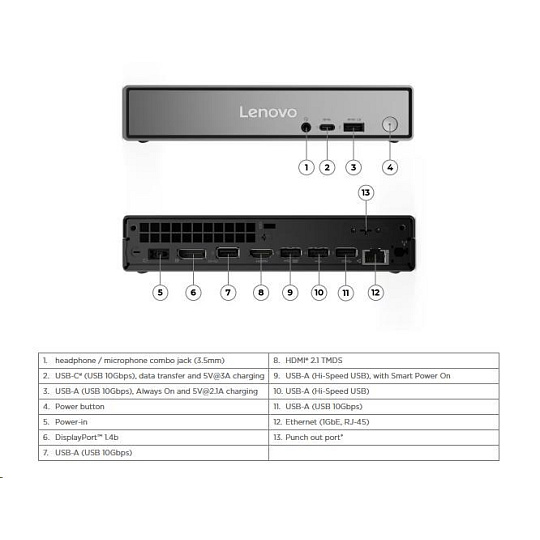 | Predné porty | 1x USB-C® (USB 10Gbps / USB 3.2 Gen 2), with data transfer and 5V@3A charging 1x USB-A (USB 10Gbps / USB 3.2 Gen 2), with Always On and 5V@2.1A charging 1x headphone / microphone combo jack (3.5mm) |