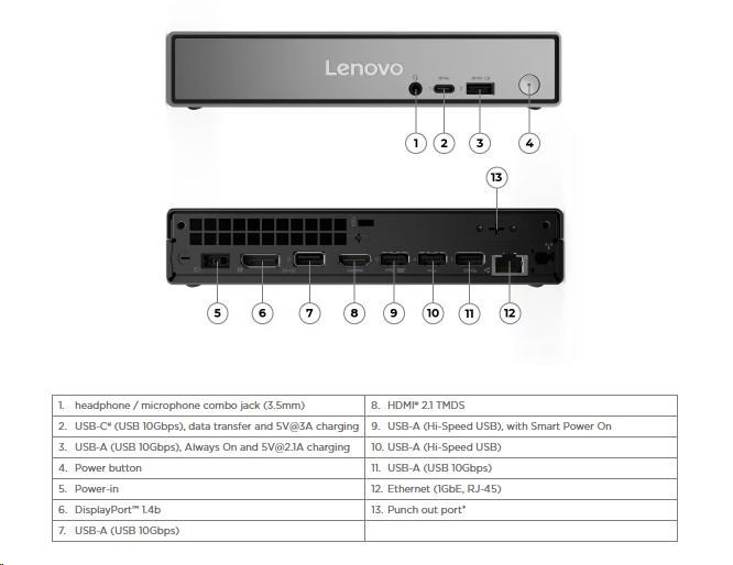 | Predné porty | 1x USB-C® (USB 10Gbps / USB 3.2 Gen 2), with data transfer and 5V@3A charging 1x USB-A (USB 10Gbps / USB 3.2 Gen 2), with Always On and 5V@2.1A charging 1x headphone / microphone combo jack (3.5mm) |