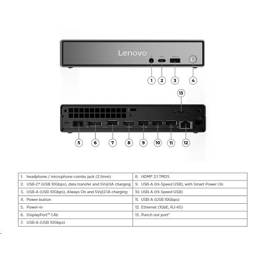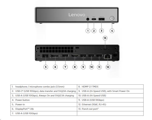 | Predné porty | 1x USB-C® (USB 10Gbps / USB 3.2 Gen 2), with data transfer and 5V@3A charging 1x USB-A (USB 10Gbps / USB 3.2 Gen 2), with Always On and 5V@2.1A charging 1x headphone / microphone combo jack (3.5mm) |