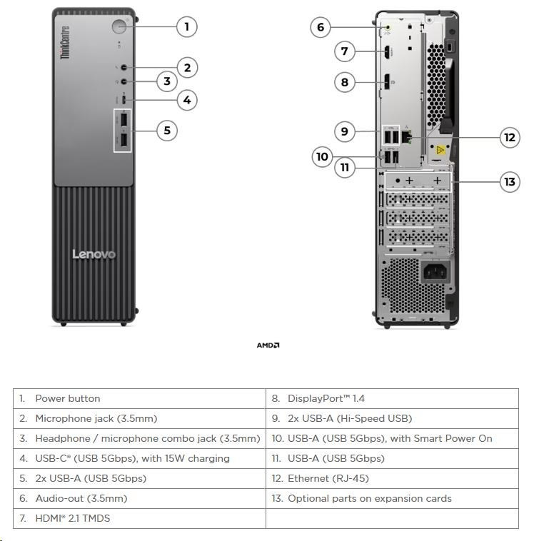 | Zadné porty | 2x USB-A (Hi-Speed USB / USB 2.0) 2x USB-A (USB 5Gbps / USB 3.2 Gen 1), one supports Smart Power On 1x HDMI® 2.1 TMDS 1x DisplayPort™ 1.4 1x Ethernet (RJ-45) 1x line-out (3.5mm) |