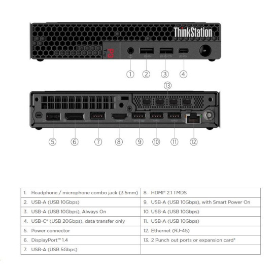 | Zadné porty | 1x USB-A (USB 5Gbps / USB 3.2 Gen 1) 3x USB-A (USB 10Gbps / USB 3.2 Gen 2), one supports Smart Power On 1x HDMI® 2.1 TMDS 1x DisplayPort™ 1.4 1x Ethernet (RJ-45) |