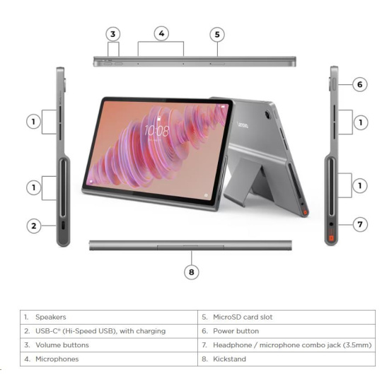 | Standartné porty | 1x USB-C® (Hi-Speed USB / USB 2.0), with charging, digital audio 1x Headphone / microphone combo jack (3.5mm) 1x microSD card slot |
