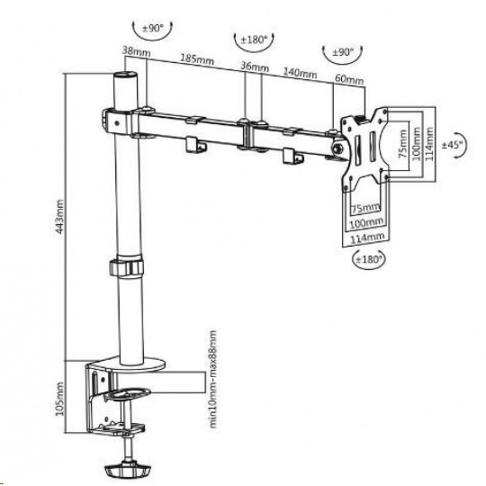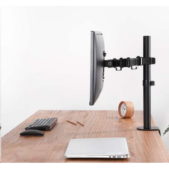 Levný kvalitný stolný držiak monitora Fiber Novelty F10 Otočný, sklopný, výškovo aj dĺžkovo nastaviteľný držiak monitora 13-32", funkcia PIVOT, 2 typy uchytenia na stolovú dosku, nosnosť 8kg Levný, predsa kvalitný stolný držiak na uchytenie LCD LED OLED monitoru s uhlopriečkou 13 až 32 palcov. Po uchytení monitoru na držiak oceníte zväčšený priestor na stole, monitor navyše môžete podľa ľubovôle otáčať do strán, nakláňať, vysúvať a aj výškovo nastavovať, monitor je možné rotovať pre horizontálne alebo vertikálne otočenie. Držiak podporuje VESA štandardy 75x75 a 100x100. Držiak je možné zaťažiť monitorom s hmotnosťou až 8kg. Ramienka sú osadené úchytmi na zafixovanie kabeláže. V balení nájdete 2 typy uchytenia na stolovú dosku, ktorá môže mať priemer 10mm až 88mm. Dodávame v čiernej farbe, balenie obsahuje potrebný inštalačný materiál. Levný držiak na monitor 13-32 palcov Fiber Novelty F10 splní požiadavky aj náročným zákazníkom, pritom za zlomok ceny iných držiakov na monitory. Otočný, sklopný, dĺžkovo a výškovo nastaviteľný, funkcia pivot, vedenie kabeláže, 2 úchyty na stolové dosky... Levný stolný držiak na monitor do vašej pracovne alebo kancelárie - plne nastaviteľný, vynikajúca kvalita - Fiber Novelty F10 Technické údaje: nosnosť 8kg podpora VESA štandardu 75x75 a 100x100 odporúčame na monitory s uhlopriečkou 13 až 32" otáčanie do strán +/- 360° naklonenie +/- 45° vysunutie monitora až 421mm nastavenie výšky, max. 420mm nastavenie tuhosti chodu ramien uchytenie na stolovú dosku s priemerom 10 až 88mm 2 typy uchytenia na stolovú dosku úchyty na káble montážny materiál farba čierna záruka 3 roky