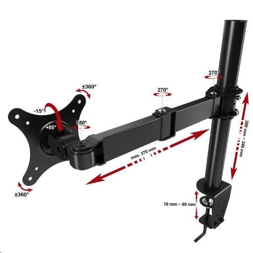 Kompletná špecifikácia Kvalitný stolový držiak poctivej konštrukcie Ergosolid NF11 Jednoducho polohovateľný stolový držiak na monitory 10-30", VESA 75x75 a 100x100, otočný, sklopný, nastavenie výšky, pivot, nosnosť 10kg Ponúkame Vám nový stolový držiak na monitory s inovovaným systémom na nastavenie výšky, ku ktorému nebudete už potrebovať náradie. Držiak umožňuje nastavenie polohy monitora 3D - otáčanie do strán, náklon, rotácia, výška a vzdialenosť. Uchytenie je možné na okraj všetkých stolových dosiek o hrúbke 20-100mm. Držiak podporuje VESA 75x75 a 100x100, nosnosť je 10kg. Farebné prevedenie čierne. Záruka 3 roky. Poctivý držiak na monitory s uhlopriečkou 10-30 Technické údaje: nosnosť 10kg na monitory s uhlopriečkou 10" až 30" podpora VESA 75x75 a 100x100 snadné výškové polohovanie 200÷340mm nastavenie vzdialenosti od nosníka až 435mm otáčanie do strán +/- 360° náklon +85° až -15° rotácia monitoru - nastavenie obrazovky na šírku alebo na výšku systém vedenia káblov inštalácia na okraj stola na všetky stolové dosky o priemere 20÷100mm poctivá pevná konštrukcia s dôrazom na detaily materiál oceľ farebné prevedenie čierne záruka 3 roky