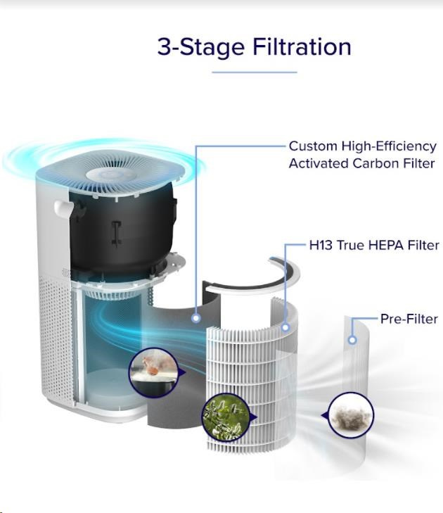 Posledný, vysoko účinný uhlíkový filter potom odfiltruje dym, pachy, výpary a ďalšie najmenšie častice. Celkovo čistič Levoit CORE Core 600S zachytáva až 99,99 % všetkých nečistôt, a to až do miniatúrnej veľkosti 0,1 mikrónu. Zostáva vám len čerstvý a čistý vzduch.