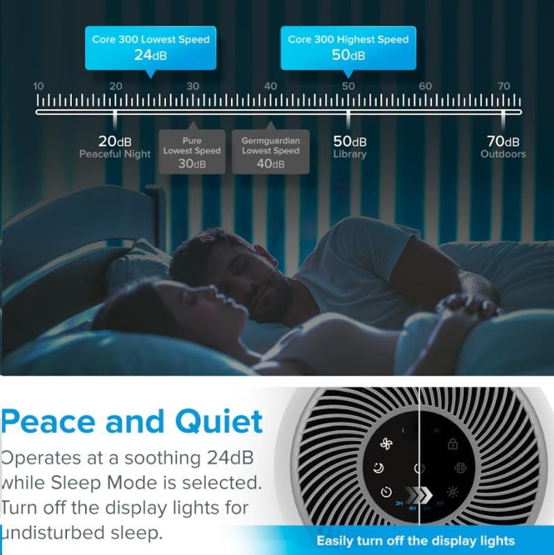 Vďaka patentovanej technológii QuietKEAPTM ani nebudete vedieť, že je čistička Levoit Core 300S v prevádzke. Pre nerušený spánok bol navrhnutý špeciálny nočný režim s hlučnosťou iba 24 dB. V nočnom režime sa tiež aktivuje tlmené osvetlenie alebo môžete svetlo úplne vypnúť. Špeciálne táto nízka hlučnosť je výhodou proti čističkám vzduchu iných výrobcov.