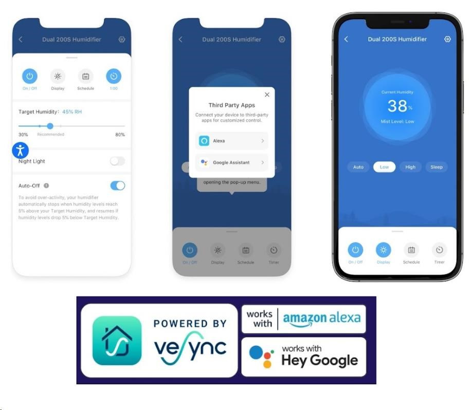 Zvlhčovač vzduchu Levoit Duall200S Smart je možné ovládať priamo na prehľadnom podsvietenom LED displeji alebo aj cez aplikáciu na chytrých zariadeniach Apple alebo Android. Alebo si ho môžete dokonca pripojiť do svojho Smart Home a ovládať hlasom cez Google Assistant alebo Amazon Alexa. Senzor vlhkosti zobrazuje vlhkosť v reálnom čase av automatickom režime tak okamžite reaguje na zmeny vlhkosti. Vždy by sa malo jednať o rozmedzie medzi 40 % až 60 %. Cez aplikáciu si môžete informácie kontrolovať alebo si svoje režimy plánovať.