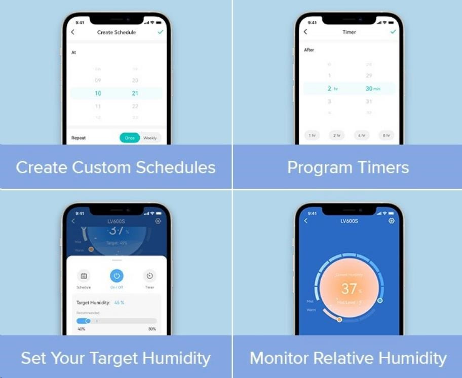 Zvlhčovač vzduchu Levoit LV600S Smart je možné ovládať priamo na prehľadnom podsvietenom LED displeji alebo aj cez aplikáciu na chytrých zariadeniach Apple alebo Android. Alebo si ho môžete dokonca pripojiť do svojho Smart Home a ovládať hlasom cez Google Assistant alebo Amazon Alexa. Senzor vlhkosti zobrazuje vlhkosť v reálnom čase av automatickom režime tak okamžite reaguje na zmeny vlhkosti. Vždy by sa malo jednať o rozmedzie medzi 40 % až 60 %. Cez aplikáciu si môžete informácie kontrolovať alebo si svoje režimy plánovať.