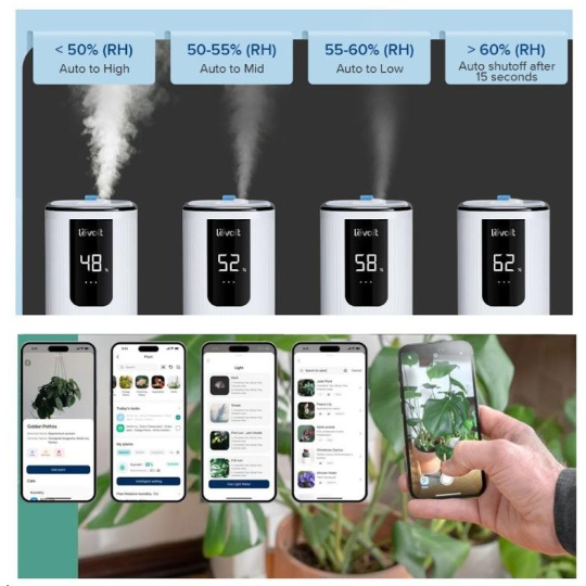 Zvlhčovač vzduchu Levoit OasisMist Smart je možné ovládať priamo na prehľadnom podsvietenom LED displeji alebo aj cez aplikáciu na chytrých zariadeniach Apple alebo Android. Alebo si ho môžete dokonca pripojiť do svojho Smart Home a ovládať hlasom cez Google Assistant alebo Amazon Alexa. Senzor vlhkosti zobrazuje vlhkosť v reálnom čase a v automatickom režime tak okamžite reaguje na zmeny vlhkosti. Vždy by malo ísť o rozmedzie medzi 40 % až 60 %. Cez aplikáciu si môžete informácie kontrolovať alebo si svoje režimy plánovať.