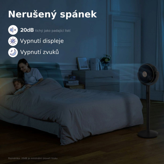 Stojanový ventilátor Levoit je ideálnym spoločníkom na pokojný spánok, pretože jeho hlučnosť je len 20 dB, čo je porovnateľné s šepotom. Pre maximálne pohodlie môžete jednoducho vypnúť displej, aby vás počas noci nerušili žiadne svetelné signály. Navyše možno deaktivovať všetky zvuky, čím sa zabezpečí, že vás nič nebude rušiť z odpočinku a relaxácie.