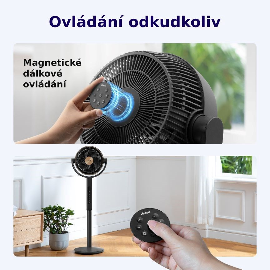 Stojanový ventilátor Levoit je vybavený praktickým magnetickým diaľkovým ovládaním, ktoré sa ľahko pripevní na stred ventilátora, takže ho budete mať vždy na očiach. Tento šikovný dizajn zaručuje, že diaľkové ovládanie už nikdy nestratíte a budete ho mať po ruke vždy, keď ho budete potrebovať. Ovládanie funguje na diaľku, takže môžete nastavenia upravovať pokojne po celej miestnosti bez toho, aby ste museli vstávať z pohodlia kresla alebo postele.