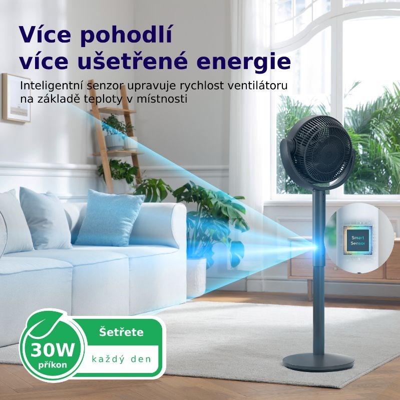 Stojanový ventilátor Levoit je vybavený snímačom teploty, ktorý automaticky reguluje výkon podľa aktuálnej teploty v miestnosti, čím zabezpečuje optimálny komfort. Vďaka nízkej spotrebe energie len 28 W je tento ventilátor energeticky úsporným riešením na každodenné používanie. Navyše ponúka 12 rýchlostí, ktoré umožňujú plynulú prevádzku bez náhlych prechodov, takže si môžete ľahko nastaviť ideálnu úroveň chladenia podľa svojich potrieb.