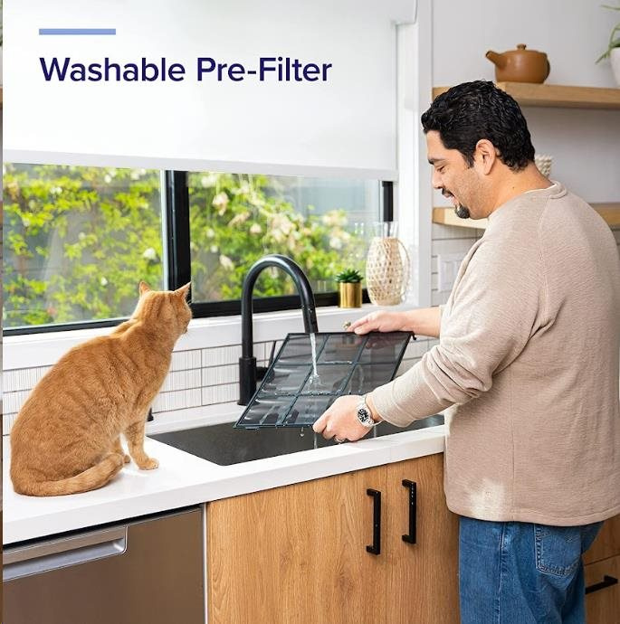 Konstrukcia umožňuje používateľom ľahko vybrať predfiltrov a vyčistiť ho, kedykoľvek je to potrebné, namiesto častej výmeny ako pri jednorazových filtroch. Možnosť zbaviť sa tých najhrubších nečistôt umytím nielenže dlhodobo šetrí peniaze, ale tiež znižuje množstvo odpadu, čím je Levoit Vital 100S šetrný k životnému prostrediu. Pri dôkladnom umývaní a údržbe predfiltrov stačí meniť filter raz ročne (za bežného prevádzky, v závislosti od podmienok).