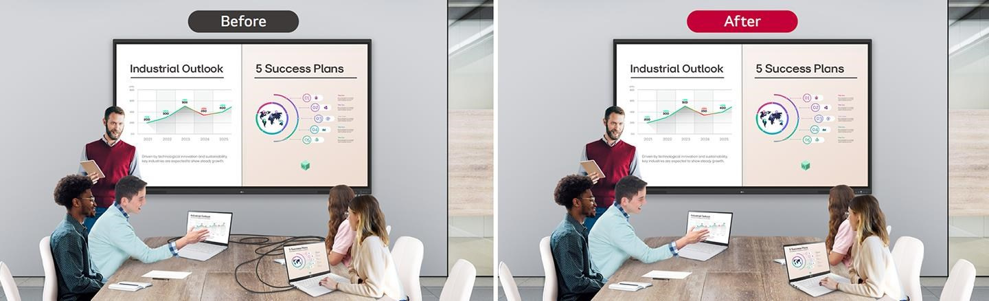 LG CreateBoard Share umožňuje plynulé a stabilné prostredie pre stretnutia vďaka technológii bezdrôtového zdieľania obrazovky – bez potreby ďalších káblov či pripojení. Prezentujúci môžu voľne zdieľať svoje obrazovky bez nutnosti neustáleho odpojenia a pripájania káblov. Vďaka možnosti zdieľať až 9 obrazoviek súčasne je možné zobraziť materiály od viacerých účastníkov naraz, čo zvyšuje efektivitu spolupráce a tímovej produktivity.