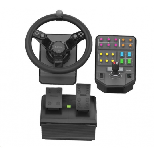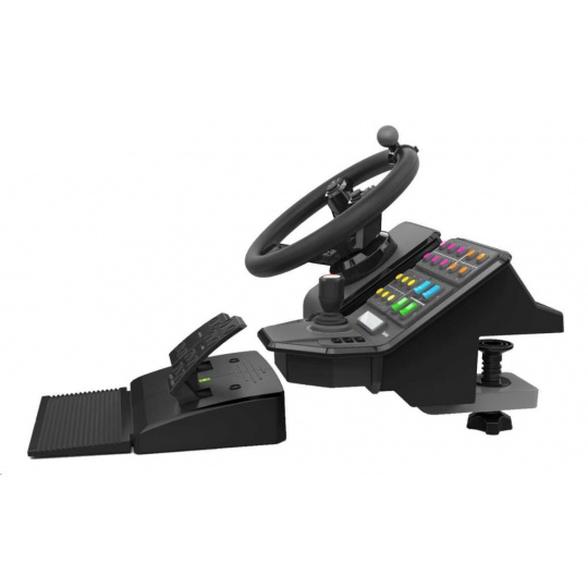 | Package contents | - Heavy equipment wheel with 2 m USB connector cable - Gas and brake pedal set with 1.8 m USB connector cable - Side panel control deck with 2 m USB connector cable |