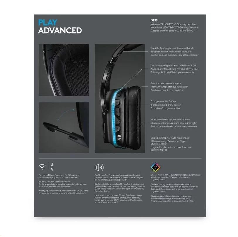 Logitech herní sluchátka G935, Wireless 7.1, LIGHTSYNC Gaming Headset - EMEA
