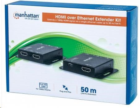 Súprava Manhattan 1080p HDMI over Ethernet Extender Kit je ideálnym riešením na pripojenie prakticky akéhokoľvek zdroja HDMI (PlayStation, Xbox, Blu-ray prehrávač, satelitný prijímač, digitálny rekordér atď.) k HD displeju alebo projektoru až do vzdialenosti 50 m (164 ft.) od zdroja prostredníctvom jedného ethernetového kábla Cat6. Tieto napájané extendery HDMI poskytujú spoľahlivý prenos videa s rozlíšením 1080p a viackanálového zvuku na väčšie vzdialenosti, ako je to možné len pomocou káblov HDMI. Modul vysielača má navyše ďalší výstupný port HDMI, ktorý umožňuje umiestnenie druhého monitora v riadiacej skrini alebo pripojenie druhého displeja. Na dodatočnú kontrolu kvality obsahuje súprava Manhattan 1080p HDMI over Ethernet Extender Kit prepínač EDID na minimalizáciu problémov so zobrazením, zabudovaný prepínač ekvalizéra na korekciu dlhodobého blikania obrazovky a širokopásmový IR blaster a prijímač na diaľkové ovládanie zdrojového zariadenia.