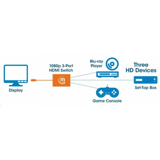 Trojportový prepínač HDMI Manhattan 1080p umožňuje multimediálnym nadšencom pripojiť tri zdroje videa HDMI - vrátane herných konzol, prehrávačov Blu-ray, satelitných prijímačov, digitálnych rekordérov, set-top boxov a ďalších zariadení - na jeden displej s vysokým rozlíšením.