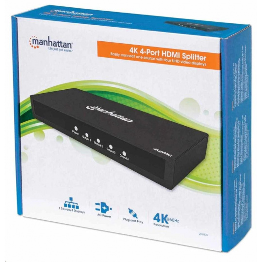 Manhattan HDMI Splitter, 4K 4-portový HDMI Splitter, 4K@60Hz, napájanie AC, čierny