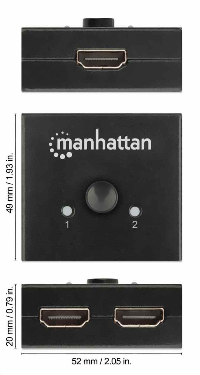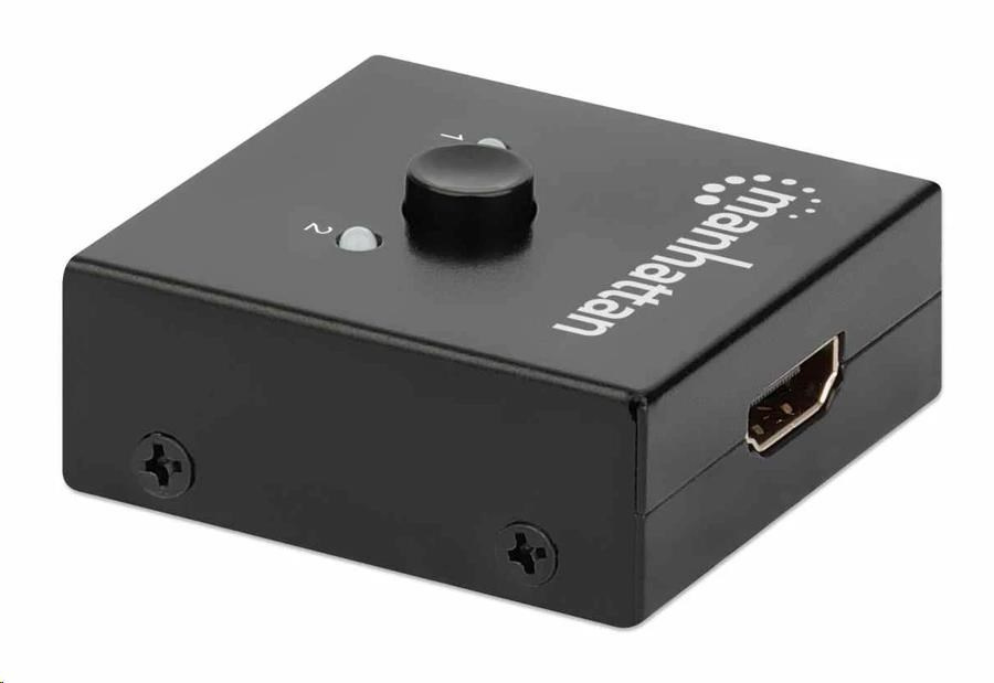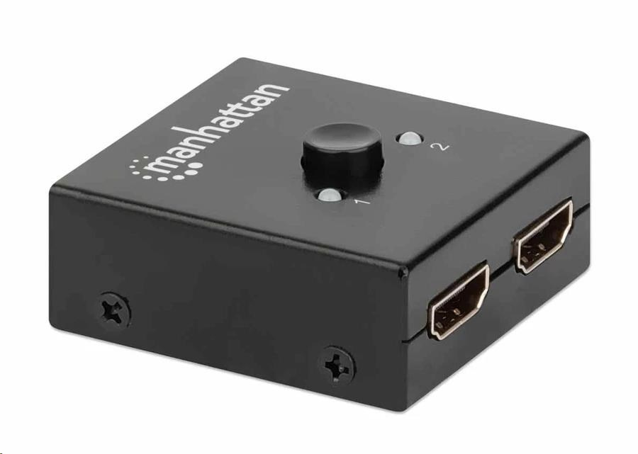 Dvojsmerný 2-portový rozdeľovač HDMI Manhattan 4K so zabudovaným zosilňovačom umožňuje zdieľať signál 4K HDMI z jedného zdroja UHD na jednom z dvoch displejov UHD alebo pripojiť dva zdroje UHD a prepínať medzi nimi na jednom displeji UHD.
