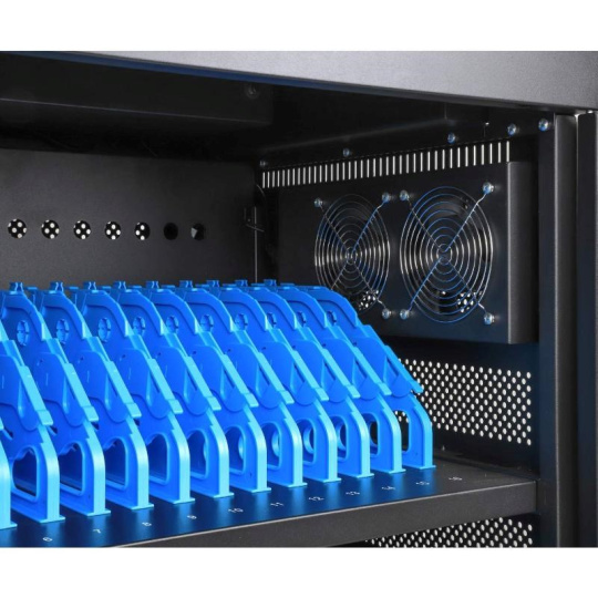Vstavané AC zásuvky v PDU na zadnej strane jednotky uľahčujú nabíjanie zariadení, ako sú notebooky, tablety, telefóny a mnoho ďalších, pomocou ich napájacích adaptérov alebo stenných nabíjačiek. Správcovia majú pohodlný prístup cez dvierka na zadnej strane jednotky, aby sa mohli pripojiť do zásuviek a viesť káble ku zariadeniam v prednej časti.